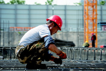 工人正在绑扎钢筋。