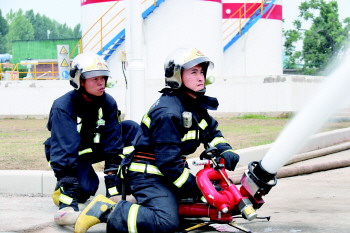 灭火战斗小组使用泡沫枪对着火点进行灭火。
