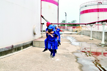 演练模拟配送中心储罐区4#储罐二道阀发生泄漏,当班巡检人员发现后,立即启动一级应急响应,紧急关阀,拉响警报,设置现场警戒,进行围堵抢修。随后模拟在油品回收过程中柴油突然起火,造成人员受伤,立即启动三级应急响应,请求政府增援,同时灭火战斗小组立即使用泡沫枪对着火点进行灭火,采用喷淋装置对中心罐及相邻罐进行冷却降温,控制火势,防止蔓延。
