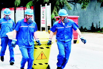 工作人员紧急转移有害化学品。