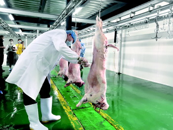 5月29日下午,在菏泽市冠博清真肉类有限公司屠宰车间内,畜牧部门兽医正在进行同步检疫,检查完成后,检查合规的屠宰羊加盖了检验检疫合格标识。“我们驻场官方兽医主要在屠宰环节把好四关,进场关、宰前临床检查关、同步检疫关和出厂关。在羊只屠宰的过程中,我们实施同步检疫,分别在头蹄岗、内脏岗、胴体岗、复检岗对宰后应检器官和部位的病理变化进行观察判断,看是否有口蹄疫,小反刍兽疫、炭疽等八种法定的传染病和寄生虫病。经检疫合格,由官方兽医出具《动物检疫合格证明》,并加施检疫合格标志。”菏泽市牡丹区畜牧水产服务中心动监所城区分所所长李光朋介绍道。