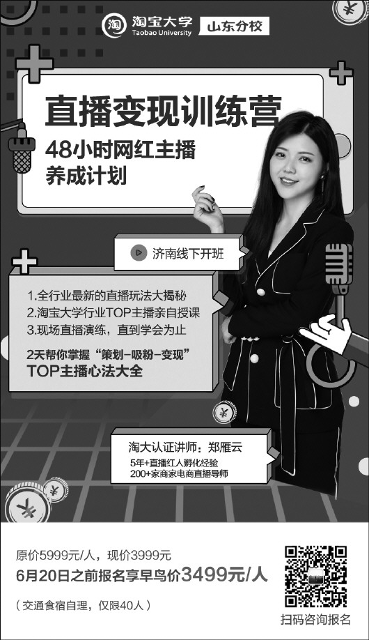 在直播带货这趟快速行驶的列车上,电商巨头、短视频平台提供着各项软硬件设备,素人、明星、企业等都拿着票陆续搭乘。今夏,为了帮助更多素人主播实现直播变现的梦想,齐鲁晚报联合淘宝大学内容学院推出48小时网红主播养成计划——《直播变现训练营》,用两天的时间帮助素人主播掌握“策划-吸粉-变现”全过程心法。