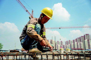 工人正在绑扎钢筋。
