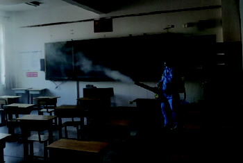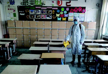 消毒 复学前,温泉学校邀请天童志愿服务中心的志愿者进行专业的全面消毒,教室、走廊、卫生间、专用室等,总面积达2万平方米。(刘新伟)