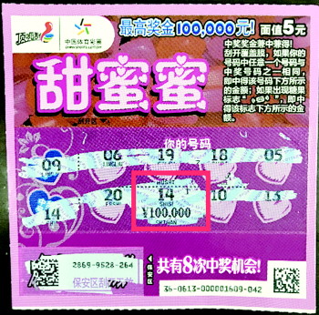 “甜蜜蜜”这款即开型彩票自推出后,一直备受购彩者喜欢,经常中出的大奖更是成就了很多爱情传奇。愿有情人终成眷属,也愿体育彩票传递更多的正能量和公益大爱给需要帮助的人。 (小荷)
