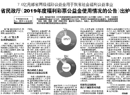 7.6亿元部省两级福彩公益金用于我省社会福利公益事业 省民政厅《2019年度福利彩票公益金使用情况的公告》出炉   据了解,截至2020年5月,我省累计销售福利彩票1774亿元,筹集公益金523亿元。      “一老一小”皆大事   扶老爱幼助民生   都说“上有老,下有小”,老人和孩子是最让人挂念的群体。而因福彩公益金的存在,一部分老人们得以安享晚年,困难儿童得以健康成长。   《公告》显示,在17641万元中央福彩公益金项目中,老年人福利类项目资金占了11917万元。这其中,养老服务体系建设项目8115万元,主要用于新建改扩建以服务生活困难和失能失智老年人为主的城镇老年社会福利机构、城乡社区养老服务设施、农村特困人员供养服务设施等;居家和社区养老服务改革试点补助资金3802万元,用于青岛市、日照市居家和社区养老服务试点方面的支出。   另外,在省本级福彩公益金项目中,2019年安排23572万元对全省养老机构新建(改、扩建)、养老机构运营、城市社区老年人日间照料中心和农村幸福院一次性建设及开办、运营转型奖补、养老服务人才培养等项目给予资助。    “福彩养老,幸福家园”,我们平时购买福利彩票的爱心之举,涓涓细流汇成汪洋大海,让我们身边的老人有所养,有所依。   在中央福彩公益金项目中,有2917万元资金用于儿童福利类项目。2019年8月,山东启动“福彩圆梦·孤儿助学工程”项目,按每人每学年1万元的补助标准用于补助符合条件的孤儿大学生及硕士研究生,《公告》显示,该项目启动以来,共使用福彩公益金1494万元。此外,另有1423万元用于农村留守儿童和困境儿童关爱服务体系建设,儿童福利机构建设和设施设备配置等。      助力残疾人事业   和社会公益事业发展   残疾人是福利彩票公益金关注的重点群体之一。30多年来,福利彩票始终秉承“扶老、助残、救孤、济困”的宗旨筹集公益金,为残疾人事业提供了资金支持,为帮助残疾群众恢复生活信心、学习实用技能、增加生活收入发挥了重要作用。   《公告》显示,在中央福彩公益金项目中,2194万元资金用于支持残疾人福利类项目。其中,被确定为首批国家康复辅助器具产业综合创新试点地区的烟台和泰安两市各补助200万元;补助我省唯一的民政精神卫生康复机构——威海市精神病人社会福利院200万元;福康工程经费283万元;用于残疾人福利机构建设和设施设备配置、康复辅助器具社区租赁服务试点等方面1311万元。另外,在省本级福彩公益金项目中,900万元补助“齐鲁福彩助残行动”,为贫困家庭配置残疾人假肢康复辅助器具。   除了大力支持残疾人事业发展外,2019年,有613万元中央福彩公益金用于支持社会公益事业类项目。其中,补助未成年人救助保护中心功能建设及购买服务项目282万元,临沂、菏泽两市的殡葬基础设施设备建设更新改造项目190万元,社会工作和志愿服务项目141万元。此外,在省本级福彩公益金项目中,5000万元用作公益性公墓建设奖补资金。   “公益福彩,为福添彩”,如今彩票的公益性被越来越多的人所认识。      织牢兜底保障网   助力打赢脱贫攻坚战   尊老爱幼、扶危济困历来是中华民族的传统美德,中国福利彩票的公益性就植根于中华文化之中。如今,购买彩票,“献爱心,作奉献”已成为广大彩民的普遍共识。   今年政府工作报告提出的一系列民生政策引发关注,其中,要切实保障所有困难群众基本生活。群众之事无小事,多年来,福利彩票把温暖和希望送到千家万户,在重点困境儿童基本生活保障、困难残疾人生活补贴、特困人员供养服务设施建设等方面作出了重要贡献。   《公告》显示,在省本级福彩公益金项目中,28500万元用于支持困难群众基本生活救助项目,统筹用于城乡低保、特困人员救助供养、临时救助、流浪乞讨人员救助以及重点困境儿童基本生活保障、困难残疾人生活补贴和重度残疾人护理补贴、“孤儿医疗康复明天计划”支出。此外,2019年安排资金700万元,用于供养特困人员服务设施(敬老院)的提升改造。   方寸之间,彰显美好。这些公益成果的背后,就是那一张张小小的福利彩票凝聚起来的力量、给予的支撑。   (张如意)   近日,省民政厅发布《2019年度福利彩票公益金使用情况的公告》(以下简称《公告》),2019年,中央拨付我省福利彩票公益金17641万元,省级财政拨付58672万元,专项用于社会福利和社会公益事业。依据福利彩票“扶老、助残、救孤、济困”的发行宗旨,重点用于为老年人、残疾人、孤儿等特殊困难群体服务的社会福利项目和受助对象直接受益的社会公益项目。