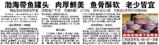 渤海带鱼罐头 肉厚鲜美 鱼骨酥软 老少皆宜 精选渤海湾深海带鱼 国营老厂手艺 肉嫩刺酥 大口吃 原价39元1罐 今明后3天特价仅需9块9   北方带鱼,一般是白眼带鱼居多,最好吃的渤海湾带鱼(又叫:刀鱼),体型比较小,肉质细腻,鱼身厚实,刺少骨小,口感极佳,咬一口全是肉!是大人孩子都适合吃的鱼。      追忆国营老厂的味道   森库带鱼罐头,采用渤海湾深海带鱼,精选带鱼肥硕中段,清洗后用植物油先炸后煮,再配以传统秘方熬制出来的汤汁浸汁调味,让带鱼更入味,经现代化加工工艺,真空封装,吃起来肉质紧实有味道,鱼肉鲜香,鱼骨酥软,老少皆宜,开罐即食,百搭下饭菜,营养丰富!所含的优质蛋白质,更容易吸收,是理想的滋补品。   不管您是凉拌,还是热炒,盖浇米饭,拌面条,早饭配粥,中午配米饭,宵夜下酒菜,上班,外出携带都非常方便,让您享受到营养方便的美味,保质期24个月,可以放心购买囤货。      惠民通知   不求利润,不赚钱,厂家为推广品牌,让老百姓吃上好带鱼,特举办厂家直销活动:原价39元/罐的森库渤海湾带鱼罐头,今天,明天,后天这3天厂价直销仅需9.9元/罐,一箱20罐,只要198元/箱,平均一罐只需9.9元!平常买1箱的钱今天可以买4箱,非常超值划算,每个家庭限购5箱,免费试吃2罐,试吃不满意,不收一分钱!2箱起全国免费包邮,足不出户,就可领略大海的风情!      渤海湾带鱼厂家说明   1.原料好,精选无污染的渤海湾深海野生带鱼,去头去尾只留中段。2.配料好,无任何防腐剂香精色素,低盐少油。3.工艺好,老汤卤汁,先煎后煮,真空密封包装。4.营养安全好,开罐即食,鱼骨鱼刺都已经焖酥,不用担心被卡到,还能将鱼骨内的钙和胶原蛋白全吃进肚子,老人小孩可以放心食用。   订购送货热线:400-871-3938   2箱起免费包邮到家 方便快捷 避免商场接触