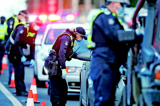 7月2日,在澳大利亚维多利亚州首府墨尔本,警察检查来往车辆。 新华/欧新