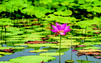 一朵荷花探出水面。