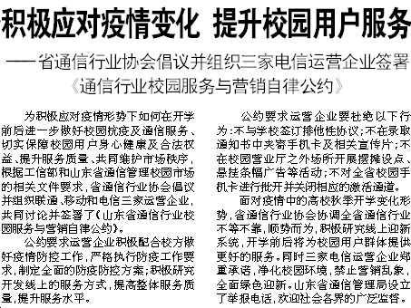 为积极应对疫情形势下如何在开学前后进一步做好校园抗疫及通信服务、切实保障校园用户身心健康及合法权益、提升服务质量、共同维护市场秩序,根据工信部和山东省通信管理校园市场的相关文件要求,省通信行业协会倡议并组织联通、移动和电信三家运营企业,共同讨论并签署了《山东省通信行业校园服务与营销自律公约》。
