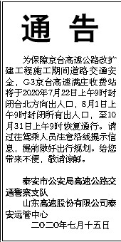 通告 为保障京台高速公路改扩建工程施工期间道路交通安全,G3京台高速满庄收费站将于2020年7月22日上午9时封闭台北方向出入口,8月1日上午9时封闭所有出入口,至10月31日上午9时恢复通行。请过往驾乘人员注意沿线提示信息,提前做好出行规划。给您带来不便,敬请谅解。 泰安市公安局高速公路交通警察支队 山东高速股份有限公司泰安运管中心 二O二O年七月十五日