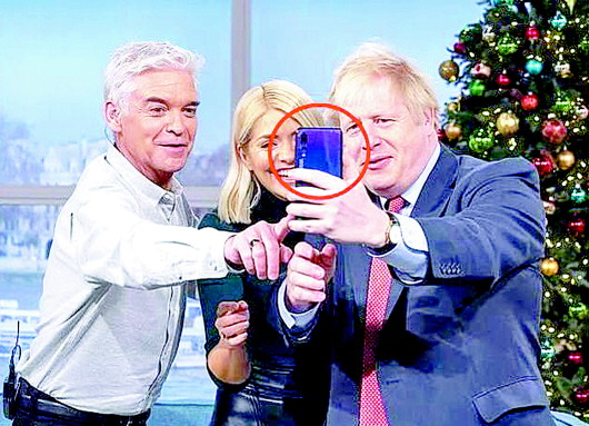英国首相鲍里斯·约翰逊(右)曾用华为手机自拍。