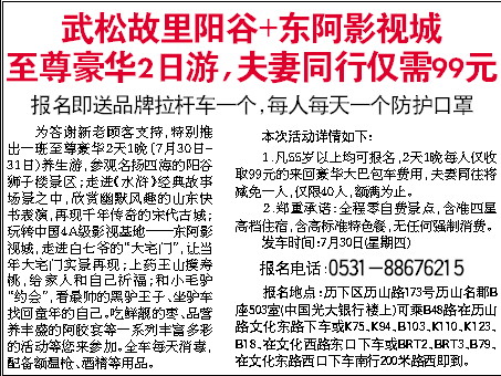 为答谢新老顾客支持,特别推出一班至尊豪华2天1晚(7月30日-31日)养生游,参观名扬四海的阳谷狮子楼景区;走进《水浒》经典故事场景之中,欣赏幽默风趣的山东快书表演,再现千年传奇的宋代古城;玩转中国4A级影视基地——东阿影视城,走进白七爷的“大宅门”,让当年大宅门实景再现;上药王山摸寿桃,给家人和自己祈福;和小毛驴“约会”,看最帅的黑驴王子、坐驴车找回童年的自己。吃鲜靓的枣、品营养丰盛的阿胶宴等一系列丰富多彩的活动等您来参加。全车每天消毒,配备额温枪、酒精等用品。