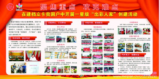 今年,按照济南市妇联的部署和要求,章丘区妇联在区委区政府的坚强领导下,聚焦重点,攻克难点,示范带动,精准施策,按照“主力与助力相融合、重点与全面同推进、攻坚与长效互促进、内力与外力共成长”的思路,在全区建档立卡贫困户中开展一星级“出彩人家”创建工作。目前,全区18个镇街组织已1500余名志愿者开展“志愿助贫户户有彩”巾帼志愿服务活动,为1969户卫生状况极差的贫困户清理院落、居室、厨房、厕所等,清理各类垃圾上百吨。除845户因拆迁、移居等特殊原因无法入户外,其余8535户均已达到一星级“出彩人家”标准。