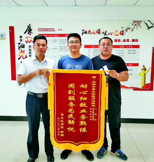 “谢谢,真心感谢咱们医保局门规科(门诊慢性病)、异地联网科、居民医保科的各位工作人员,感谢医保局,你们设身处地为我们老百姓着想,周到的服务给我和我全家帮了大忙了。谢谢!”7月23日,办事群众周先生将一面写有“耐心细致、业务熟练、周到服务、为民解忧”的锦旗送到章丘区医疗保障局工作人员手中,对两位工作人员的热情服务表示衷心感谢。据了解,周先生祖籍章丘,现定居外地,家中老人也跟随其在外地生活。疫情期间,来往不便,老人又生病住院,抱着试试看的态度电话咨询章丘区医保局。医保工作人员耐心、细致地向周先生解释、指导,帮助其通过“章丘医保”APP、微信等渠道,办理异地备案、门慢申请、联网报销等,为周先生及其家人排忧解难,让他们在异地深切感受到家乡的温暖,看到家乡的发展与进步。
