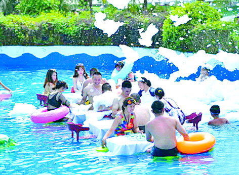 8月3日,重庆持续高温天气,涪陵红酒小镇水上乐园举行系列夏季消暑活动。其中,水中打麻将、水中玩泡泡娱乐项目吸引不少民众自由组合前来玩耍。 中新
