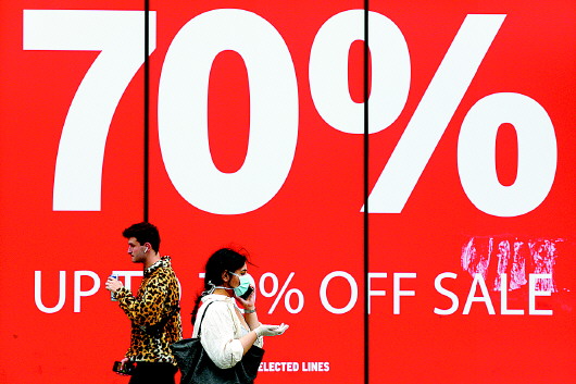今年第二季度英国GDP环比萎缩20.4%,是有记录以来最大季度降幅。图为行人从伦敦牛津街一家打折的商场旁走过。