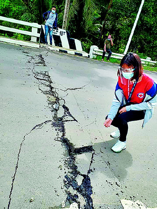 这张菲律宾红十字会提供的照片显示,18日,菲律宾中部马斯巴特省地震后道路上出现裂痕。该地18日发生6.5级地震,目前暂无人员伤亡报告。 新华