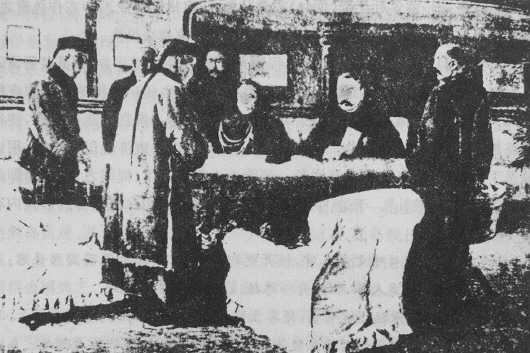 牛昶昞(左二)在《威海降约》上签字。