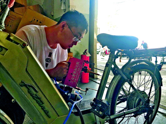 济南历黄路邮政电动车编码打刻点,工作人员正在给无编码电动车打刻编码。