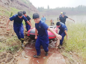 胶州蓝天救援队接到求助信息后,救援队快返小组携带救援装备迅速赶往现场展开救援,他们用冲锋舟将被困四人运送到水塘平坡处,岸上的救援人员一起配合着合力将四人安全营救上岸。