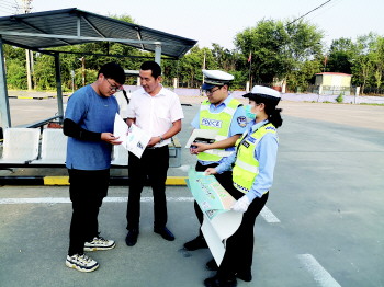 宣传民警通过发放宣传材料,向驾驶员普及交通安全知识。
