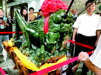 在小镇,一只身长175厘米、重达880公斤的碧玉雕刻“蟋蟀王”吸引了众多人的目光,游客纷纷拿出手机拍照、录像。创作者是汇玉堂国际玉文化博物馆馆长张锦洪,他在现场生动地讲述了“蟋蟀王”的诞生记。