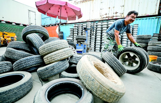 山东华嘉资源综合利用有限公司内,工作人员正在拆解轮胎。
