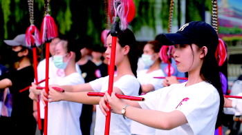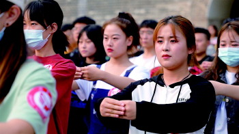 孔庙大成殿前,来自山东青年政治学院的100名舞蹈表演专业学生,身着便服,迈着“中正平和”的方正舞步,一丝不苟地排练着祭孔乐舞。