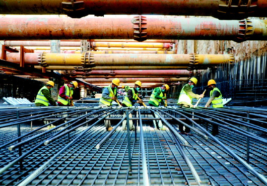 历山北路站施工人员进行钢筋绑扎。