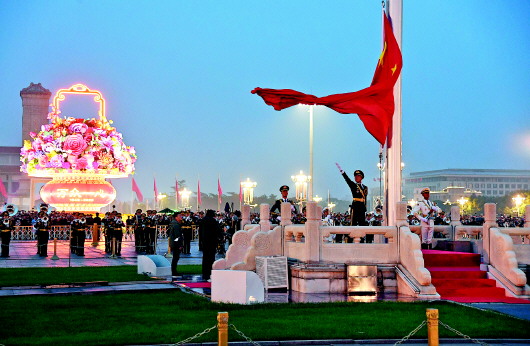 10月1日清晨,首都北京天安门广场上,来自全国五湖四海的9万多名群众庄严肃穆,等待升旗仪式的到来。