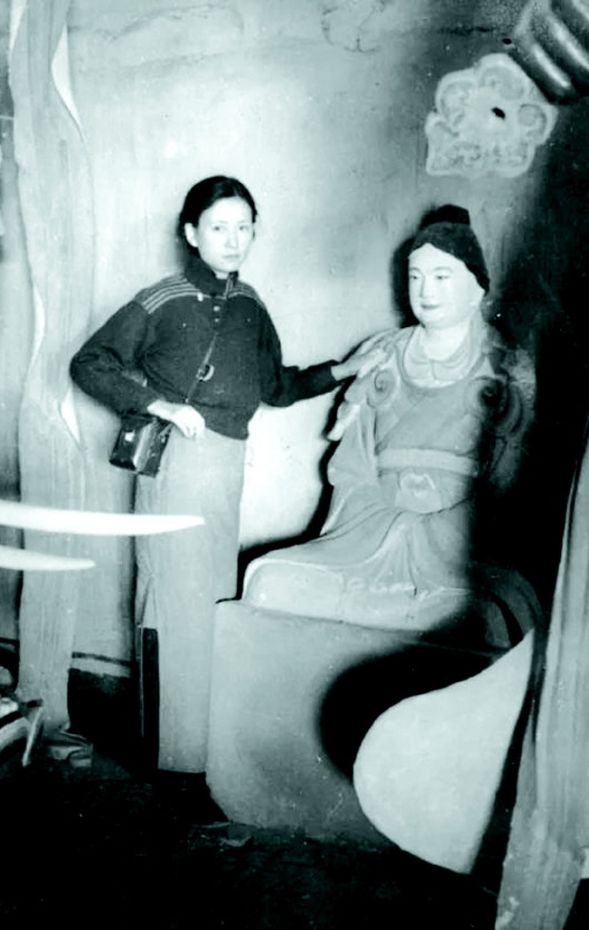 林徽因和佛光寺大殿宁公遇塑像合影。
