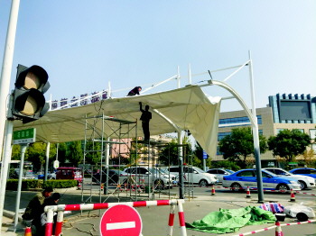 记者了解到,为提高城市市容,便捷人们出行,市政部门决定在主要路口试点安装张拉膜遮阳棚。实施了两个方案,安装两种不同类型的遮阳棚,目的是检测哪一种样式的遮阳棚既美观又实用,便于以后在全市推广。