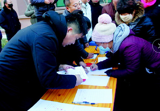 工作人员给拆迁群众办理业务。(资料片)