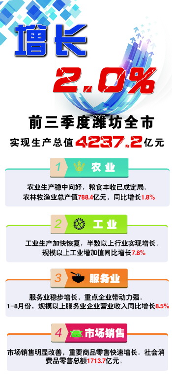 10月28日,潍坊市人民政府新闻办公室组织召开2020年前三季度潍坊市经济运行情况发布会,潍坊全市实现生产总值4237.2亿元,同比增长2.0%。其中,第一产业增加值418.2亿元,同比增长1.3%;第二产业增加值1656.96亿元,同比增长2.8%;第三产业增加值2162.04亿元,同比增长1.4%。全市在统筹疫情防控和推动经济社会发展中,见事早、行动快,经济运行总体呈现出“一季度冷、二季度暖、三季度进”的先降后升,工业生产方面半数以上行业实现增长,市场销售方面重要商品零售快速增长。