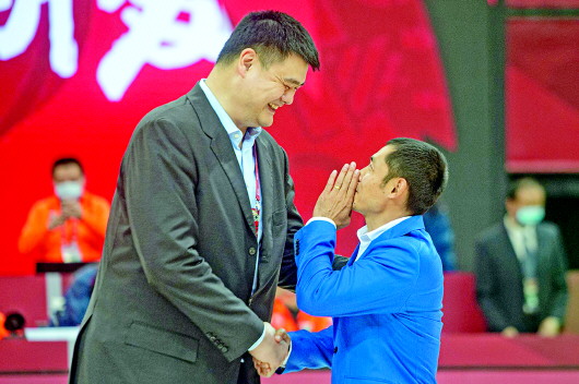 ◥在退役仪式上张庆鹏与姚明握手交流。 新华社发