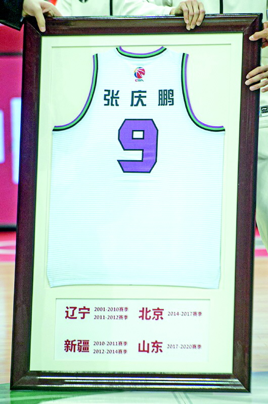 在姚明颁发给张庆鹏的纪念球衣上,记录了张庆鹏的职业履历:2001—2010、2011—2012在辽宁,2010—2011、2012—2014在新疆,2014—2017在北京,2017—2020在山东。19个赛季,10个赛季在辽宁,9个赛季辗转,张庆鹏的职业生涯,半是坚持,半是流浪,其间的滋味,他自己深有体会。这次来诸暨参加退役仪式,他又见到了很多当年的队友和教练,当年的恩怨,就算没有忘记,他也选择了和解。