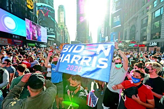 7日,拜登的支持者聚集在美国纽约时报广场。 新华社发