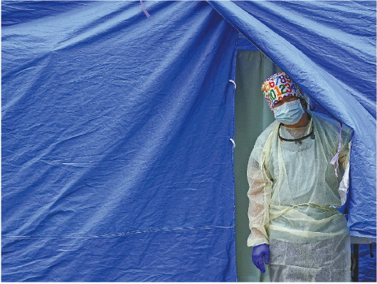 11日,美国纽约的一名医务人员在新冠病毒检测点工作。 新华/美联