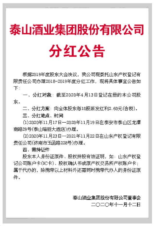 根据2019年度股东大会决议,我公司现委托山东产权登记有限责任公司办理2018-2019年度分红工作,现将具体事宜公告如下: