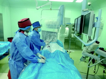 郭振元(右)为患者实施介入手术。