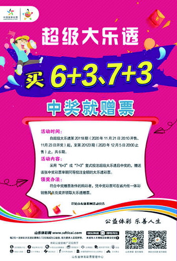 活动内容:活动期间,凡在我省体彩销售网点采用“6+3”或“7+3”复式投注超级大乐透且中奖的,赠送该张中奖彩票单期同等投注金额的大乐透彩票。多期票满足该条件的,按其活动期内中奖的期次进行赠票。例如,活动期间,某购彩者采用“7+3”复式投注购买大乐透,投注期数为1期,票面金额为126元,如当期中奖,则该购彩者即可获赠126元大乐透彩票。