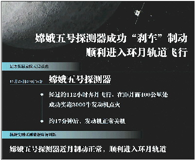 此前,11月28日20时58分,嫦娥五号探测器经过约112小时奔月飞行,在距月面约400公里处成功实施3000牛发动机点火,约17分钟后,发动机正常关机,顺利进入环月轨道。