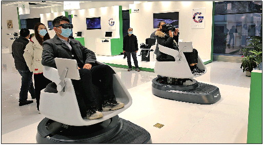 ◥采访团在歌尔股份现场体验VR影院椅。