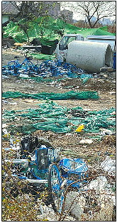 绿色围挡东侧有一处大门,可供出入,但已被牢牢锁住。从大门门缝望去,围挡内的院子空地面积颇大,院内杂草丛生、垃圾凌乱,一副拆迁过后的样子。