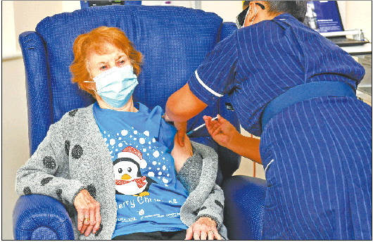 12月8日,在英国考文垂,医护人员为90岁女子玛格丽特·基南(左)接种疫苗。 新华/欧新