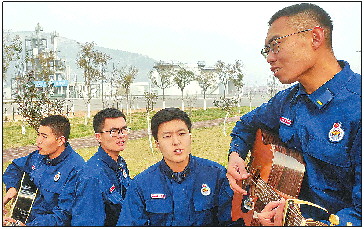值得一提的是,因为相似的兴趣爱好,郭宏柱与曲治伍、刘月俊、吴胜组建了一支名为“蓝梦”的青年乐队,还写了不少与消防有关的歌曲。授衔结束后,这支成立不到一年的乐队就要解散,四名成员也要背负着各自行囊踏上新征程,就像他们在歌中所唱:“我们逆行冲入火场,托起生的希望。橙色青春,骄傲绽放,为了那期待的目光,为了心中的太阳……不能忘烈焰铸就的荣光,不能忘最初的那些梦想。穿上橙色的战衣,到人们最需要的地方……”