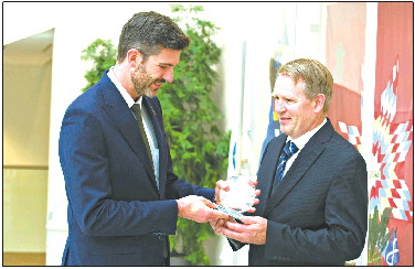 上图:加拿大埃德蒙顿市市长Don Iveson(左)祝贺喜旺获加拿大肉类行业领军奖。