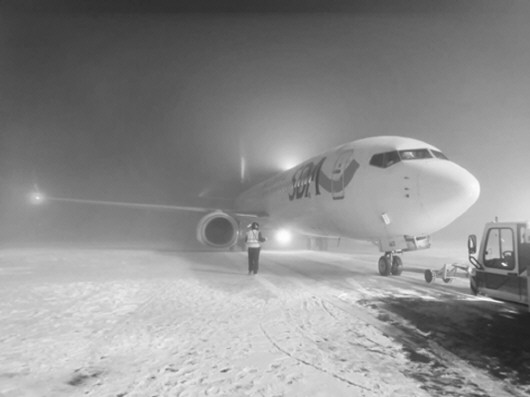 12月22日06:30,乌鲁木齐地窝堡机场突发冻雾天气,25号跑道视程短时间内由超过2000米骤降至150米,随后一直维持在150米至175米左右波动,远低于400米正常起飞标准,机场随即启动了航班大面积延误预警及HUD150米低能见度起飞程序,山航早出港7架飞机均使用HUD(平时显示仪)设备执行低能见度起飞程序突出雾围、准点起飞。