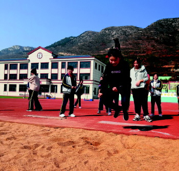 沂源县三岔中心学校举行跳远比赛活动。